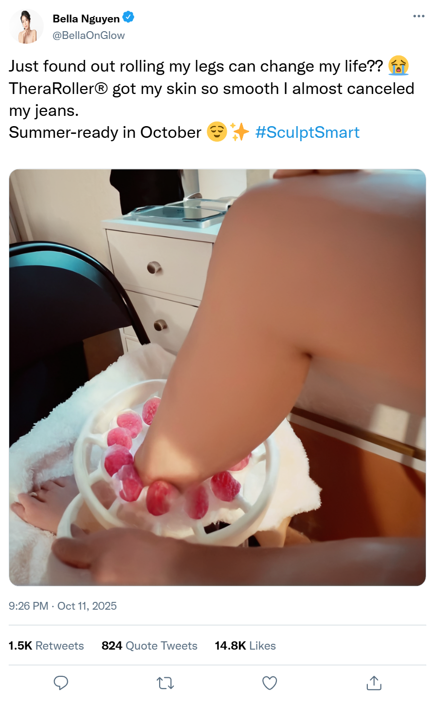 “Circulation boost, fascia release, and that post-massage glow—from home. My skin drinks it up and my body feels brand new”